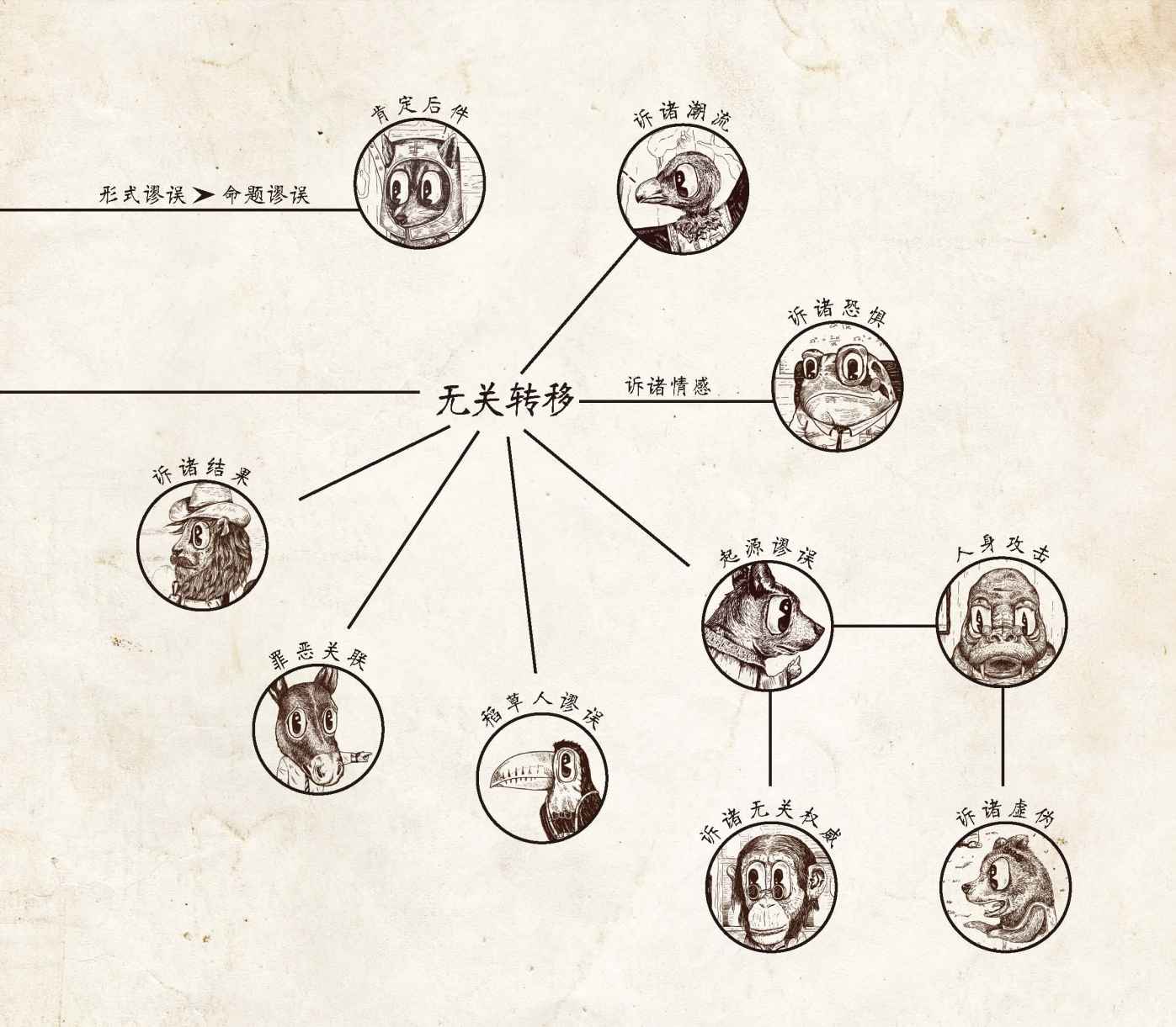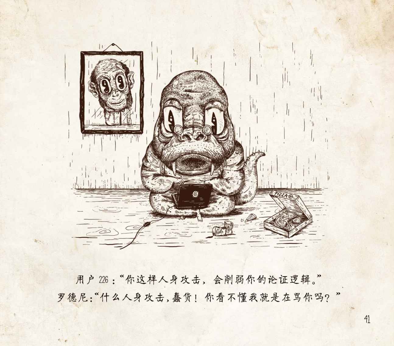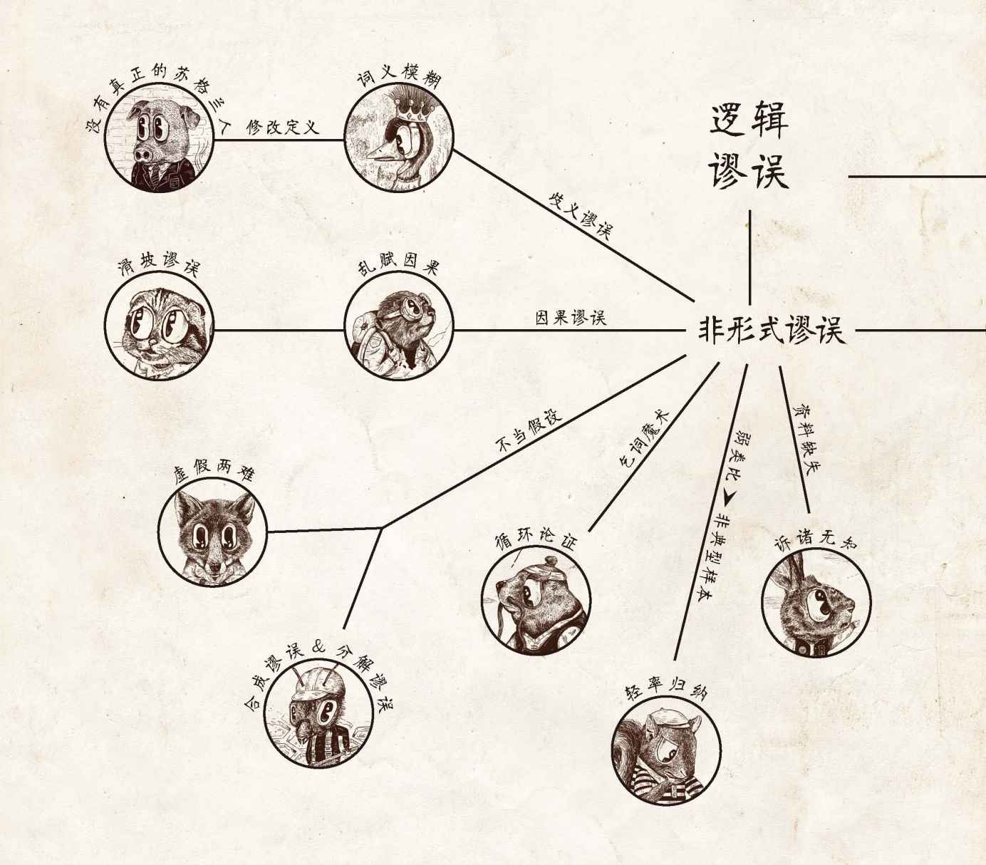 本书的新颖之处还在于,它采用了生动的插图来描绘论证中的一些常见错误,这些错误时常为害我们当今的讨论。这些插图中的一部分受到了奥威尔《动物农场》之类的寓言故事以及刘易斯· 卡罗尔②的小说、诗歌等幽默荒诞作品的启发。但与这些作品不同,本书并没有情节将各幅插图连在一起;它们各是独立的场景,唯一的联系是风格和主题,以提供更好的适用性和重复使用性。每项谬误都只有一页解释,我希望这会使它们更容易被记住和领会。